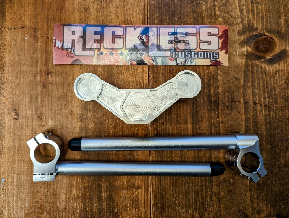 Need a custom look for you new bike. These are machined to fit perfect with your battery box and provide that custom look you are after. Constructed out of a SOLID chunk of 6061 Aluminum. Bolts onto the STOCK / OEM triple tree stem using factory bolt location for perfect centering. Get Reckless.