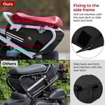 Rather than being tied to the top bar (which would interfere with the normal operation of the seat latch), our stylish baggage is held in place by 4 straps that tightly cling to the side frame, with no sliding or moving back and forth.