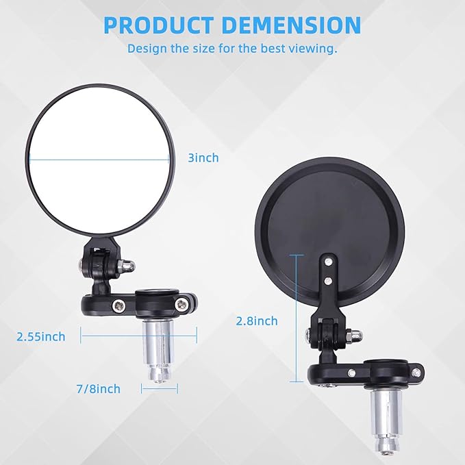 ★★ Fully Adjustment: Design of Ball-type connection joint and foldable holder, this round style bar end mirror can be 360 degrees rotated and freely adjusted up & down or sideway for the best viewing angle